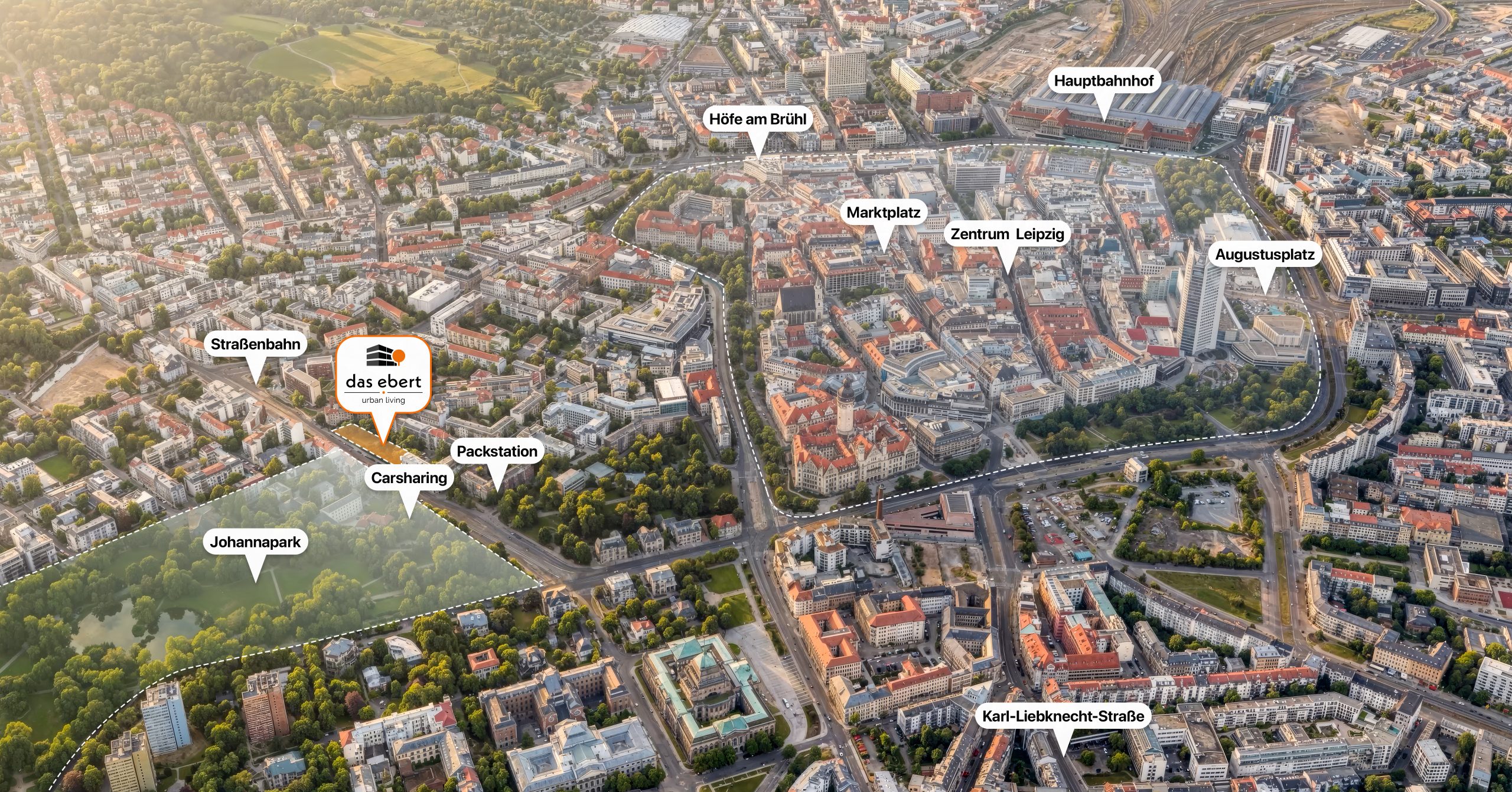 Im Spannungsfeld zwischen urbaner Dynamik und grüner Oase erstreckt sich Leipzigs Zentrum-West, eine der begehrtesten Adressen der Stadt. Die direkte Nähe zur Innenstadt verleiht dem Viertel durch Kultur, kulinarische Vielfalt und Einkaufsmöglichkeiten im direkten Radius eine kosmopolitische Note. Gleichzeitig bieten die benachbarten Grünanlagen von Johannapark und dem sich daran anschließenden Clara-Zetkin-Park großflächig Raum zur Entschleunigung: Jogger kreuzen die Wege, während Familien flanieren und auf den Wiesen gepicknickt, entspannt oder gespielt wird.
